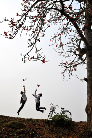 Tháng 3 hoa gạo nở đỏ đường làng ngoại thành Hà Nội, học sinh nhảy nhót, tung tăng đạp xe dạo chơi, cặp uyên ương chọn làm nơi chụp ảnh, còn sân bóng làng bỗng trở nên thơ mộng.