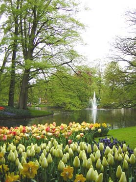 | Khu trung tâm của Keukenhof, có các luống hoa hình ngôi sao và hồ nước với các vòi phun nước rất đẹp. Keukenhof nằm ở Lisse, thị trấn ở phía nam Amsterdam, được coi là Vườn châu Âu. |